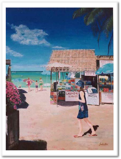 日本とは異なる青い空の色。 ビーチにはカラフルなお店、南国の花々が美しく咲いていました。 友人の姿も可愛く見え、彼女がビーチへ向かう姿を描きました。 |