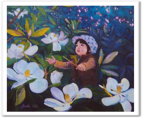 祖母が亡くなって我が家へ帰ってきたとき、白いタイサンボクが雨の中迎えてくれました。 白く大きな花の姿は高貴で潔く美しく、祖母に重なって見え、まるで花がレクイエムを歌ってくれているようでした。 祖母が誰より可愛がっていた曾孫に指揮をとってもらいました。 |