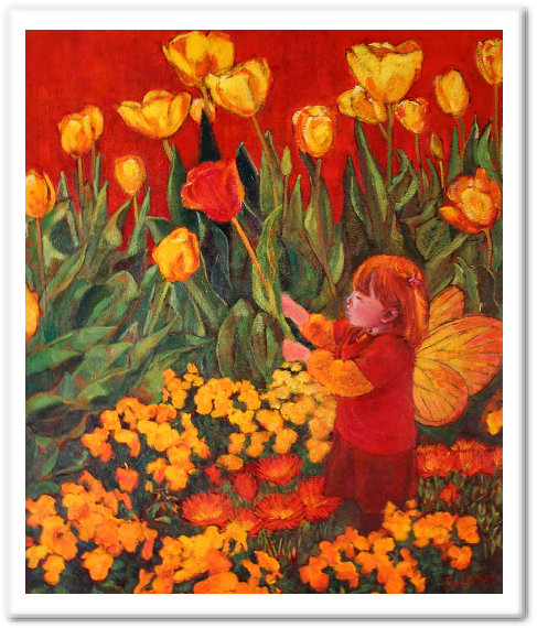 新しい生命力あふれる春が来て、いっせいに鮮やかに花が咲き乱れ、 チューリップも伸びやかに首を伸ばす。 のんびり屋の春の妖精も新しい春の主役たちに声をかけている。 そんな春の記憶。 |