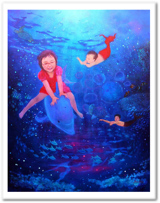 イルカに乗った少女は私が愛してやまない姪っ子です。 少し元気がなかった彼女が「崖の上のポニョ」の映画で元気をもらった姿を見て、 彼女もポニョのごとく元気に活躍できるよう描きました。 妹ちゃんは人魚ちゃんにし、毎回私の絵のモデルをしてくれる友人の息子ちゃんも人魚に描いてしまいました。 クラゲを描いて!カメも描いて!クマノミも描いて!との皆のリクエストのままに描いたので、 まとまらないかもと心配になりましたが、これはこれで?と思える楽しい絵となったような気がします。 |