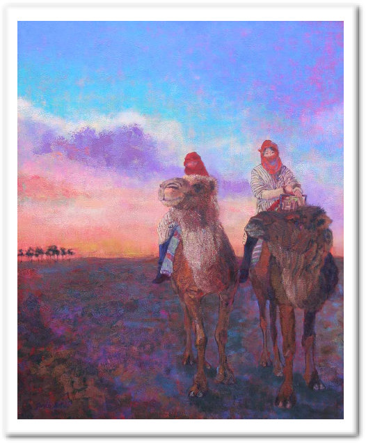 チュニジア・サハラ砂漠の朝。 どこまでも続く砂漠の朝焼けは美しく、特に空のグラデーションに感激しましたが、なかなか表現は難しく…。 また絵肌がデコボコなので画面上では実際の絵とだいぶ色合いが違って見えてしまうのが残念です。 右側のラクダに乗っている女性はこの11月に結婚した、私の友人をモデルに描きました。 新しい出発をする彼女のはなむけになればとの思いをこめて。 |