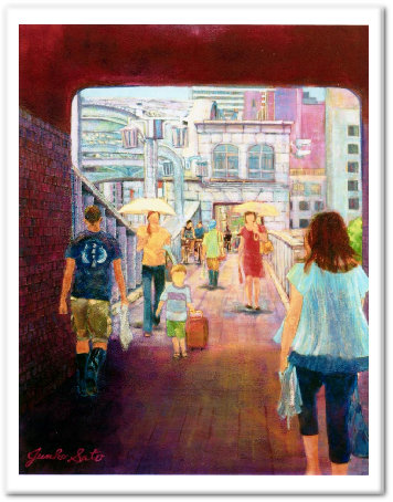 今年の夏に亡くなった祖母を偲んで何か描きたかったので、 祖母の思い出あふれる父も生まれ育った築地の勝鬨橋の歩道をゆく人を描いてみました。 勝鬨橋は昔は船が通るために橋が開閉する稼働橋だったので、歩道側には今では使われなくなった その装置がいまだに残っている趣ある橋です。 築地市場そばにあるので、歩道を行き交う人々も多様な面白い空間でありました。 |