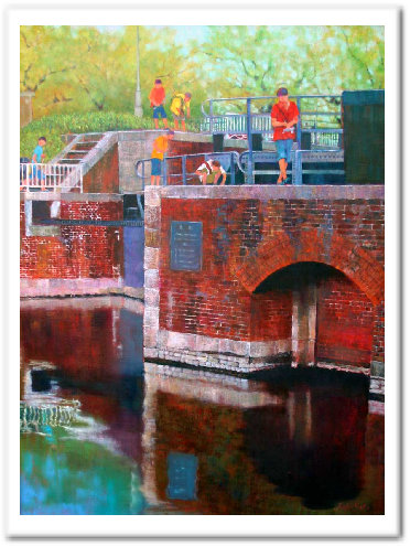 横利根川の水門です。赤いレンガの水門が素敵で父と描きに行きました。 夏休みの昼下がりで、男の子たちが水門そばでひとところに落ち着かずに釣竿を持ち歩きながら ポイントを探してあちこち動く姿が楽しそうでした。 |