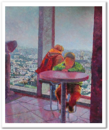ある冬の午後、お父さんと息子は六本木ヒルズの展望台へとやってきた。 良く晴れた昼下がりで窓際は暖かく、見晴らしは良く、お父さんは熱心に外をみているのだけれども、 男の子は飽きてしまった様子。 そんな二人の姿は見知らぬ人には意味ありげにみえるのだけれども、実はのどかな午後の風景。 |