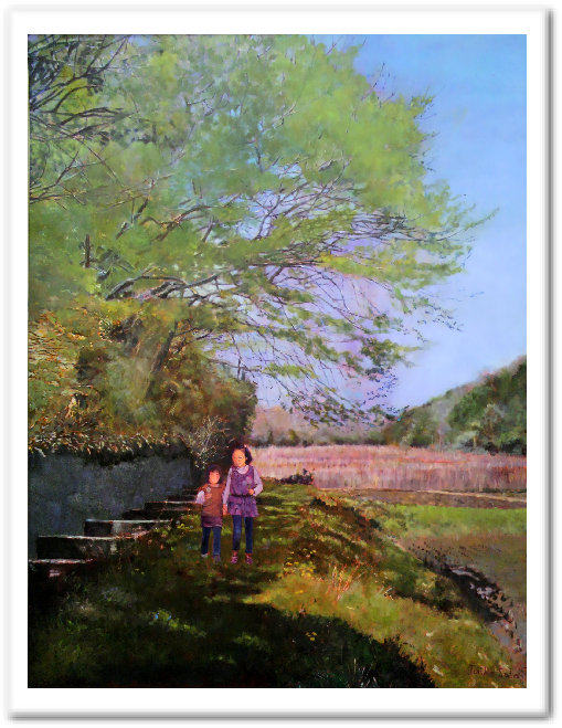 とにかく穏やかな柔らかな春の風景を描きたくなりました。 そして春を運んでくる風の如く若葉のような子供たちをその風景の中に描きたかったのです。 |